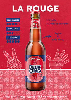 Qui a dit que le plaisir devait être pesant ? Notre Rouge bouscule les codes en mariant la puissance aromatique des fruits rouges à la signature légère de la Deux Cinq. Avec sa robe resplendissante, elle réinvente le plaisir d'un Monaco bien frais dans une version sophistiquée à 2,5% d'alcool et strictement sans sucres.